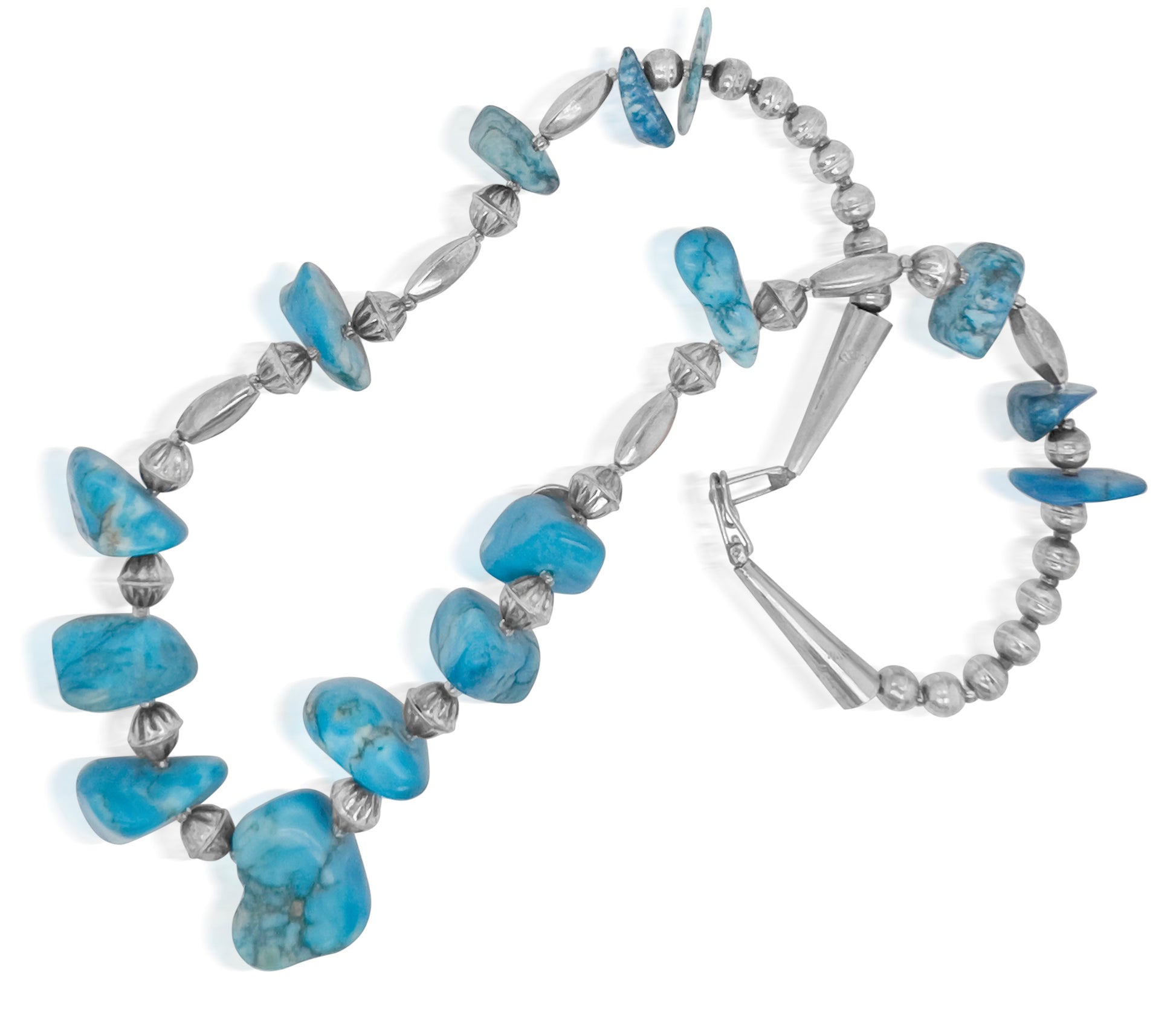 Native american necklace with tradional Sterling Silver Beads And Natural Turquoise Stones. Fish Hook Clasp. Weight 56.92.