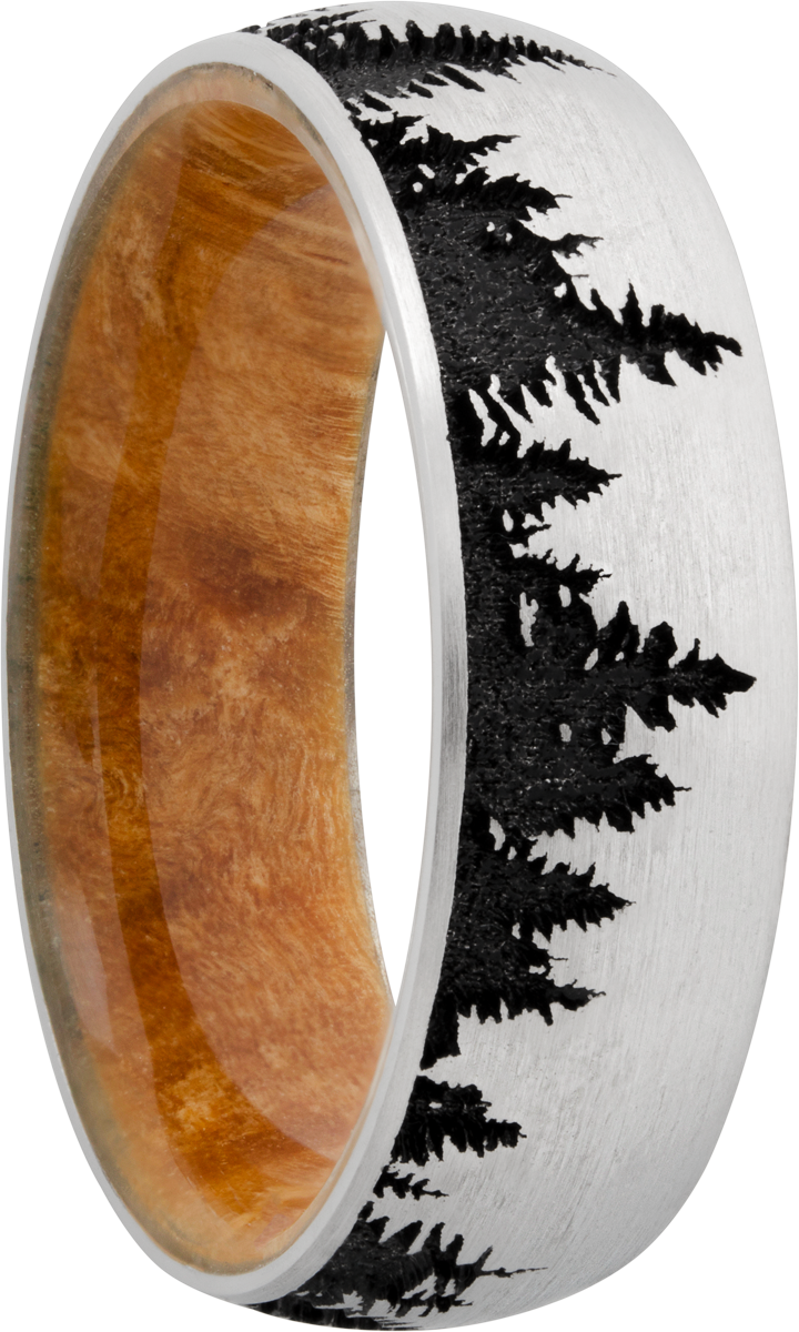 Cobalt chrome 7mm domed band featuring a laser-engraved tree pattern and a hardwood sleeve of Boxelder Burl