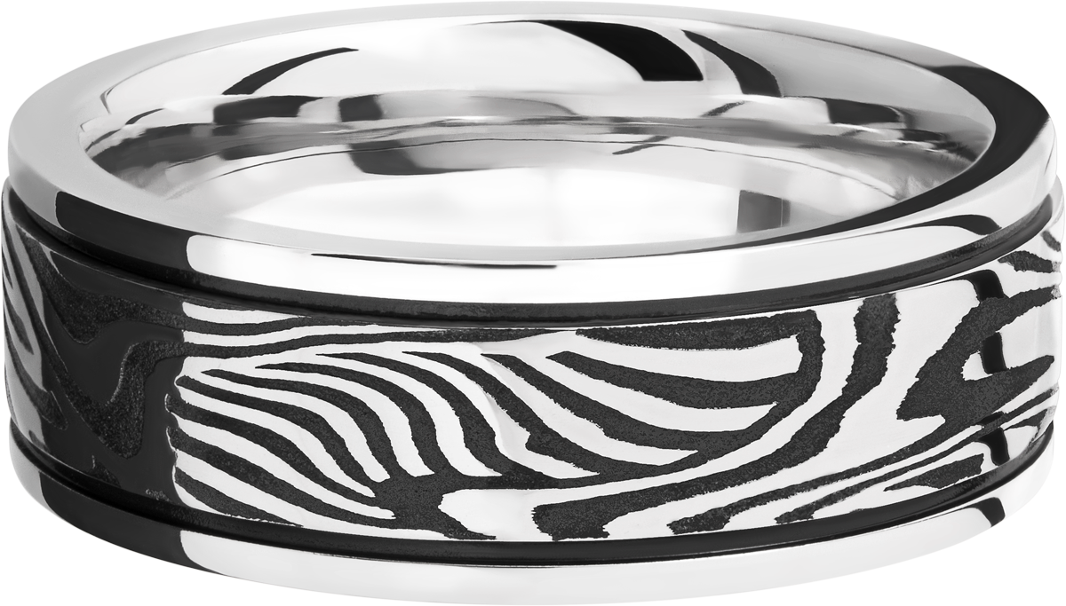 Cobalt chrome 8mm flat band with an inlay of handmade sunset Damascus steel accented with MGA on either side