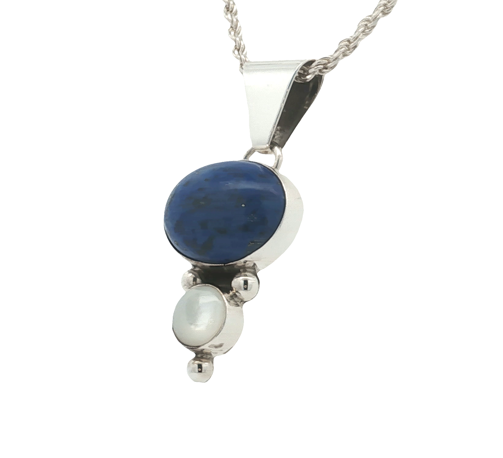 This sterling silver Drop pendant features an Oval Lapis Lazuli gemstone and Mother of Pearl, exhibiting a captivating, deep blue hue. A pearl accentuates the design, suspended vertically to enhance its classic appeal. The pendant’s composition and refined detailing render it a timeless piece, suitable for various occasions.
