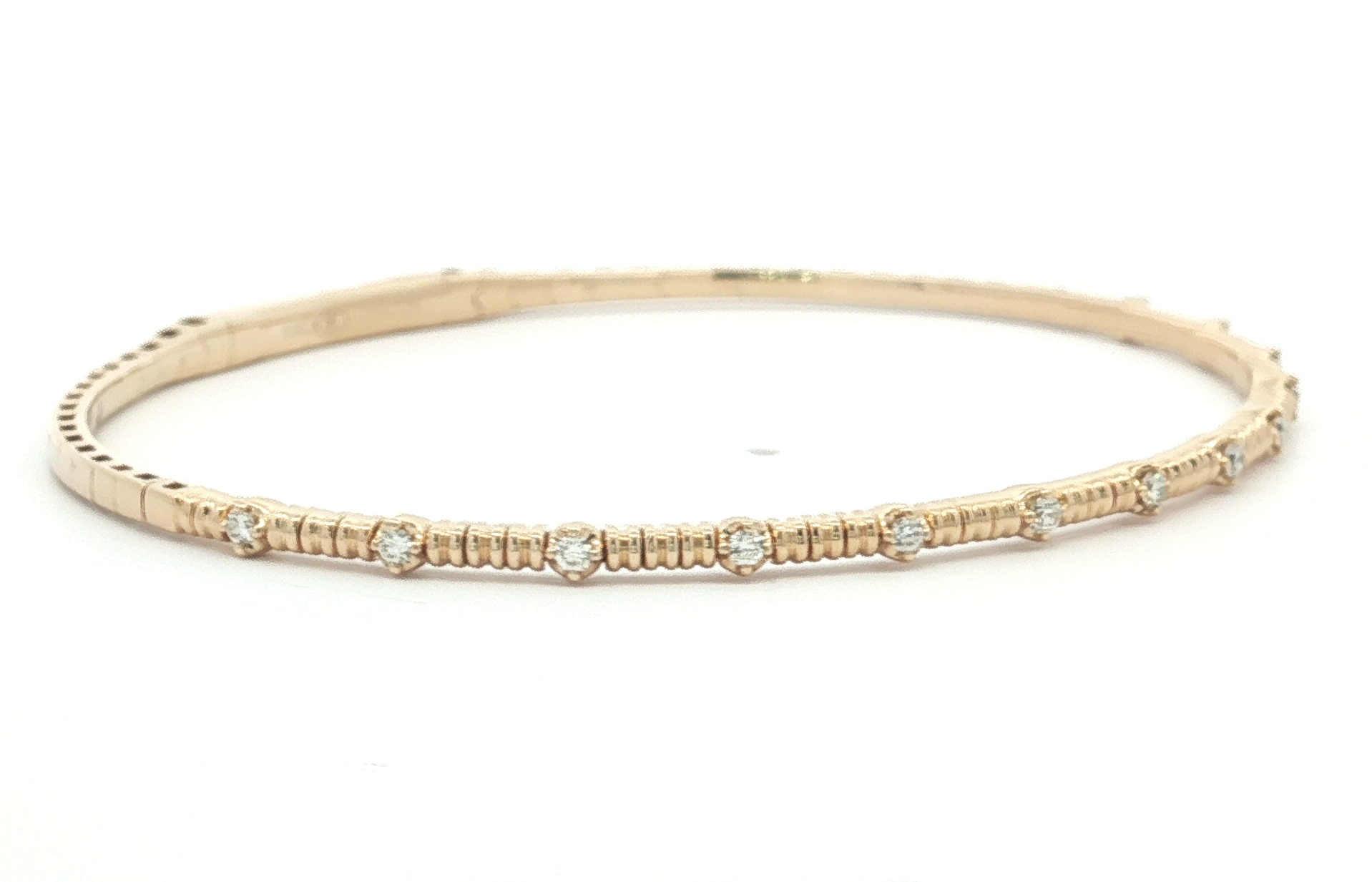 Exquisitely crafted in radiant 14K yellow gold, this elegant Flexi Bangle bracelet features a delicate row of 13 round brilliant cut diamonds. The 13 brilliant-cut diamonds are evenly spaced and meticulously set, creating a line of sparkle. This bracelet offers a timeless design, perfect for adding a touch of subtle luxury to any ensemble.