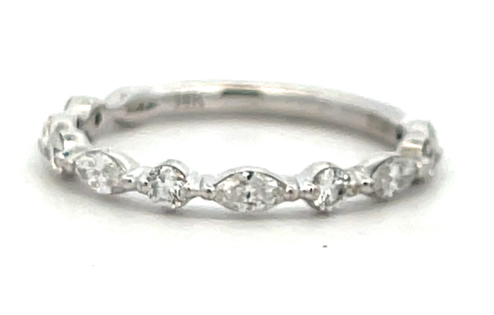 Exquisite A. Jaffe 14K white gold Wedding band featuring a sequence of brilliant cut marquise alternating round cut diamonds. The diamonds are meticulously set, creating a seamless and continuous sparkle. This ring symbolizes everlasting love and commitment, making it a perfect wedding band or anniversary gift.