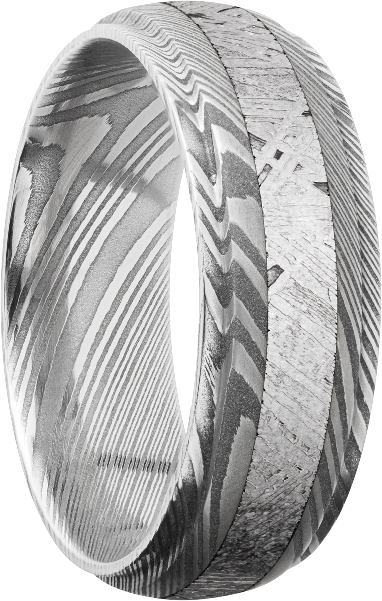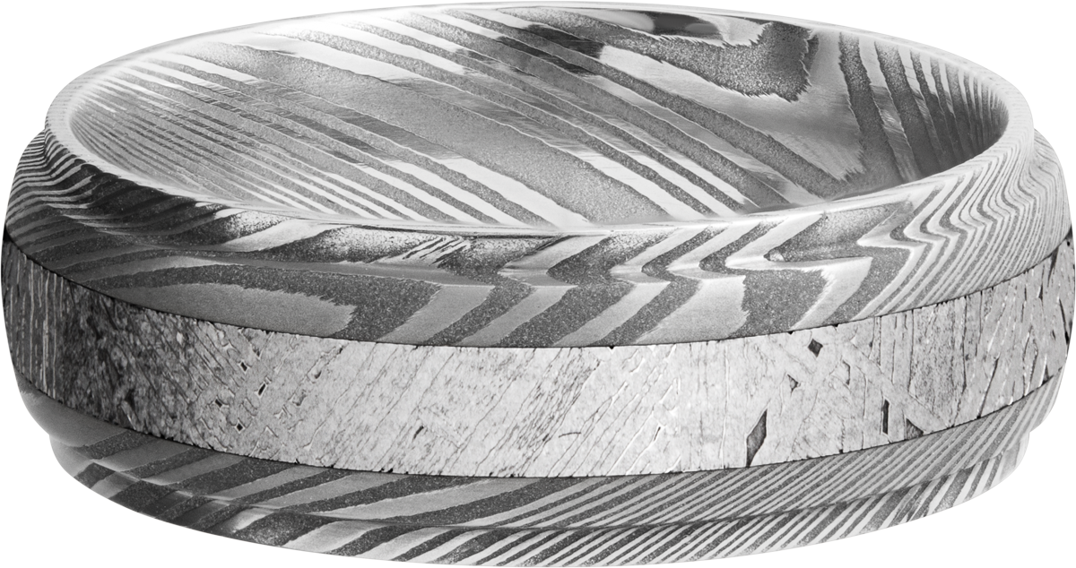 Handmade 7mm Damascus steel band with an inlay of authentic Gibeon Meteorite