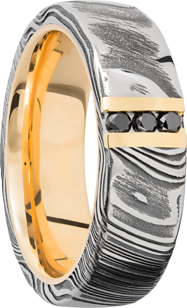 Handmade 7mm Woodgrain Damascus steel band featuring 3, .03ct channel-set black diamonds and a 14K yellow gold sleeve