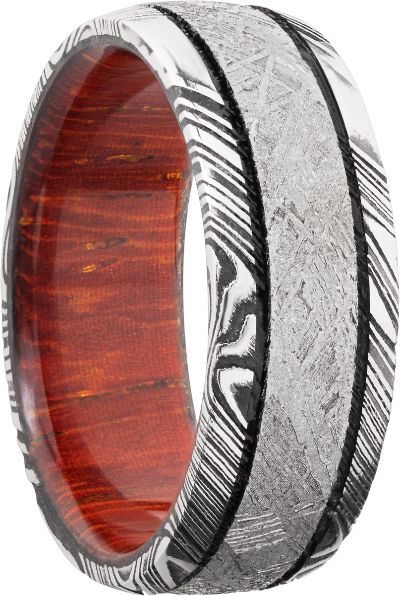 Handmade 8mm Damascus steel domed band with an inlay of authentic Gibeon meteorite and a hardwood sleeve of Padauk