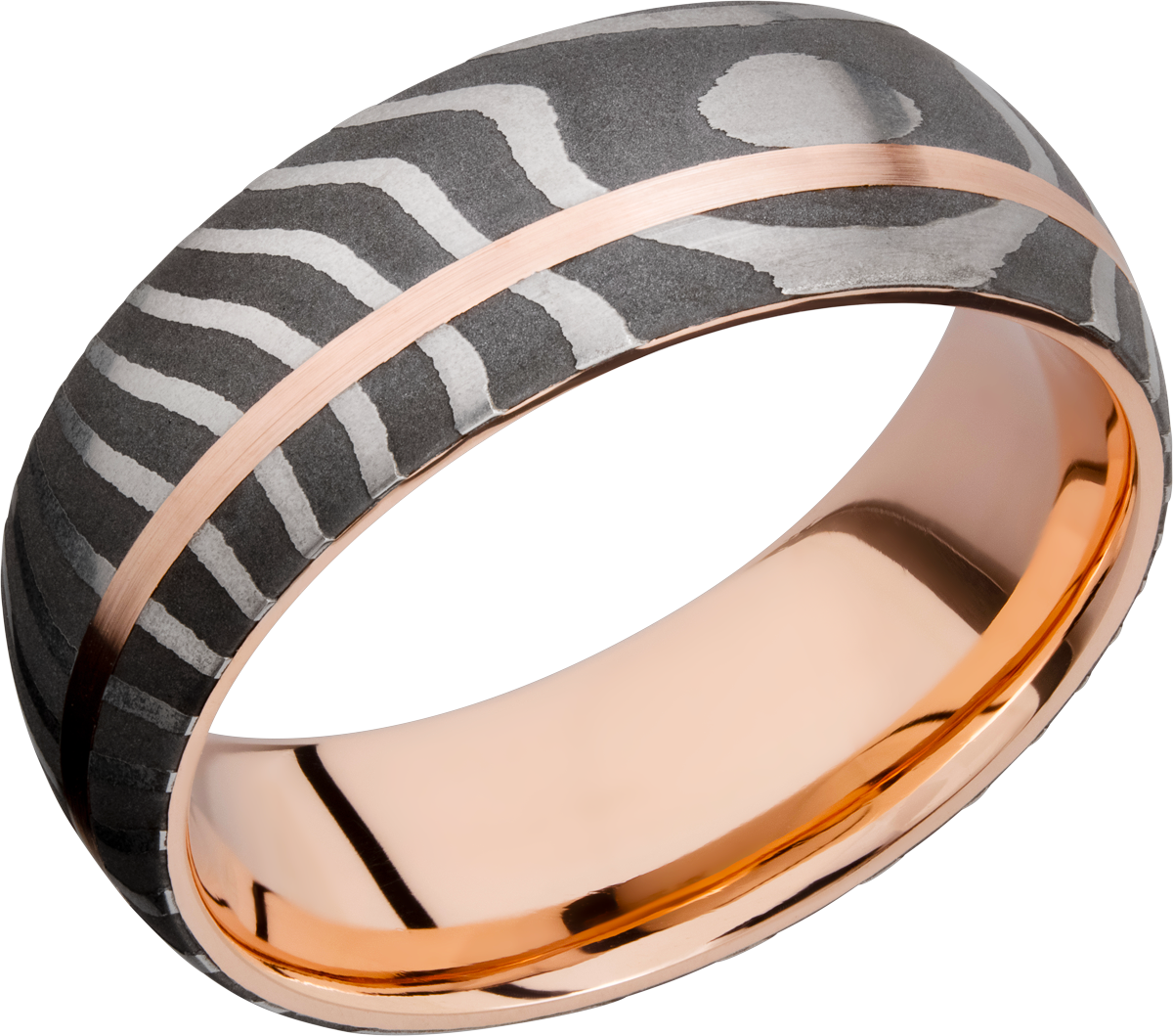 Handmade 8mm Tiger Damascus steel band featuring a sleeve and off-center inlay of 14K rose gold
