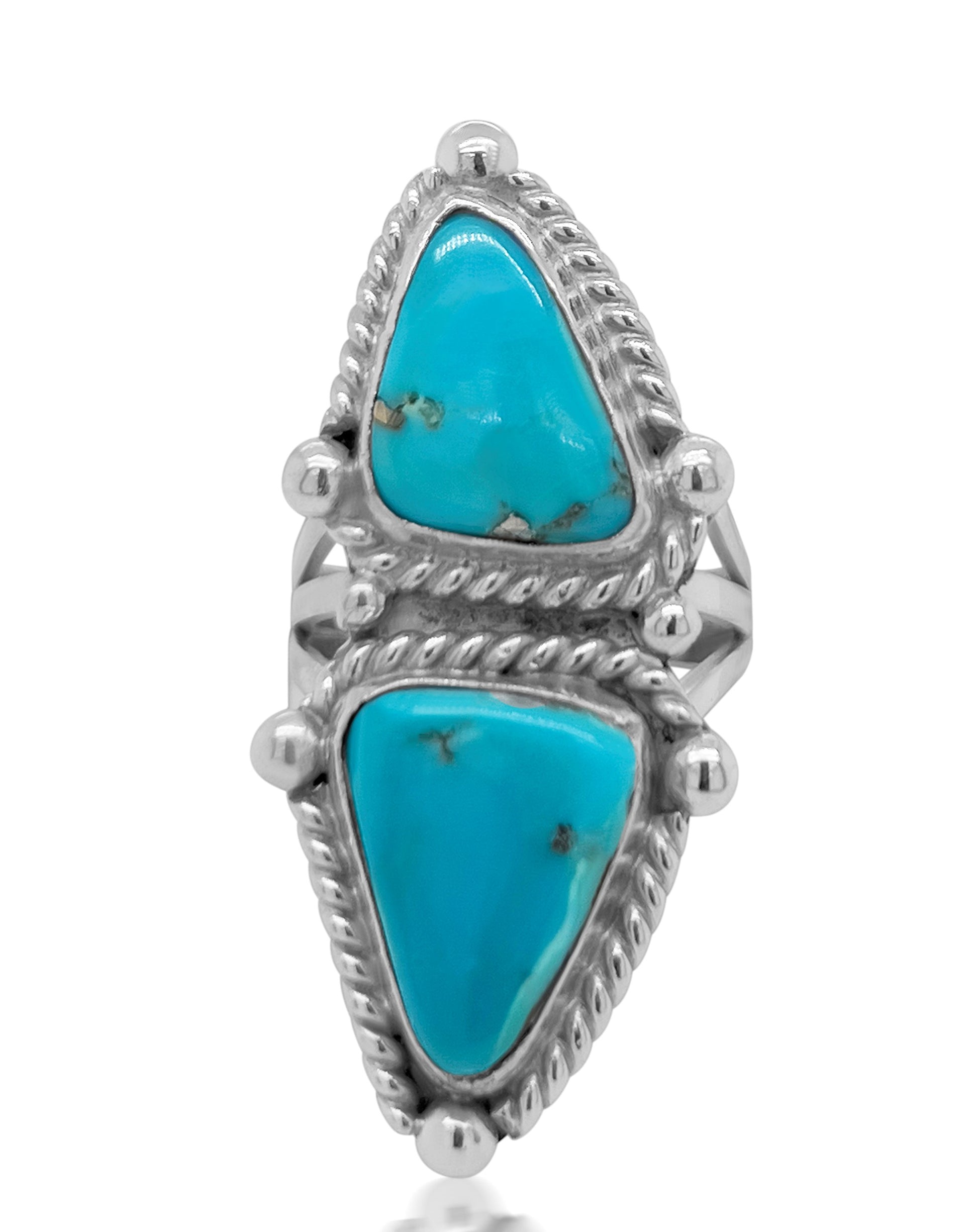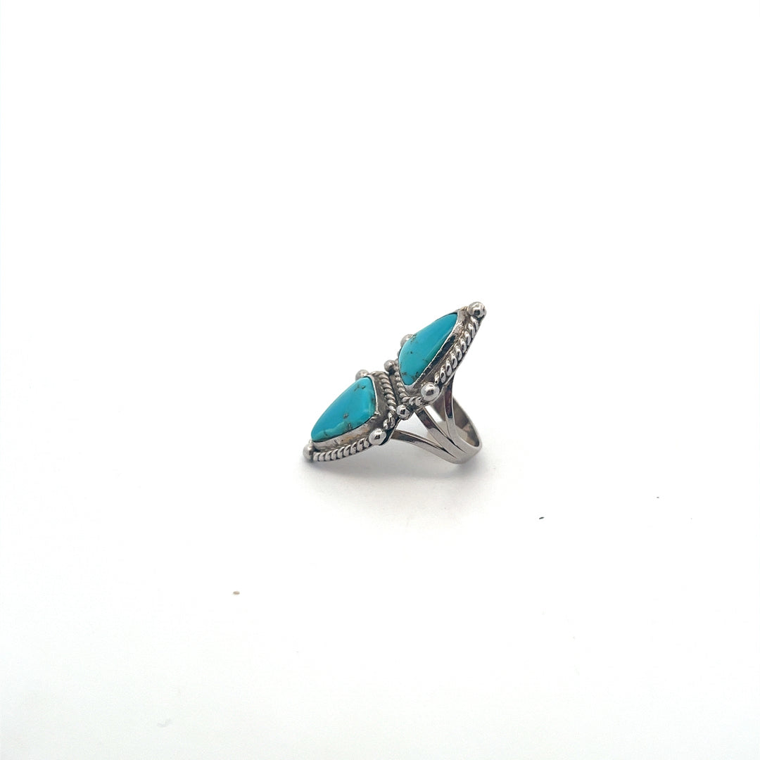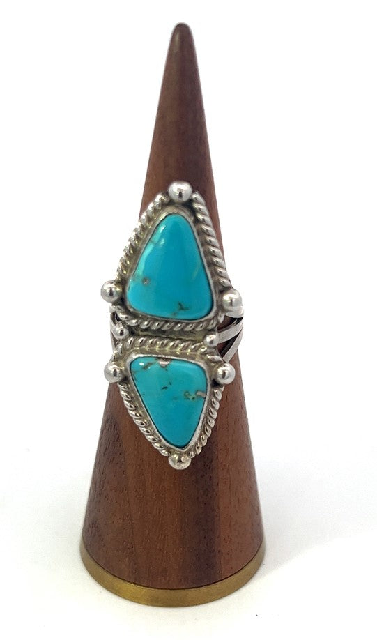 Native American Vintage Sterling Silver Ring With 2 Large Triangle Shaped Turquoise Stones. Encased In Twistdesign. Triangle End To End.
