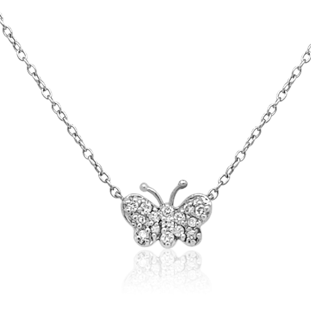 Lady's White 14 Karat Butterfly moti fNecklace15=0.15Tw Round H/I Si2 Pave Diamonds, with attached cable link chain total 17 inches long