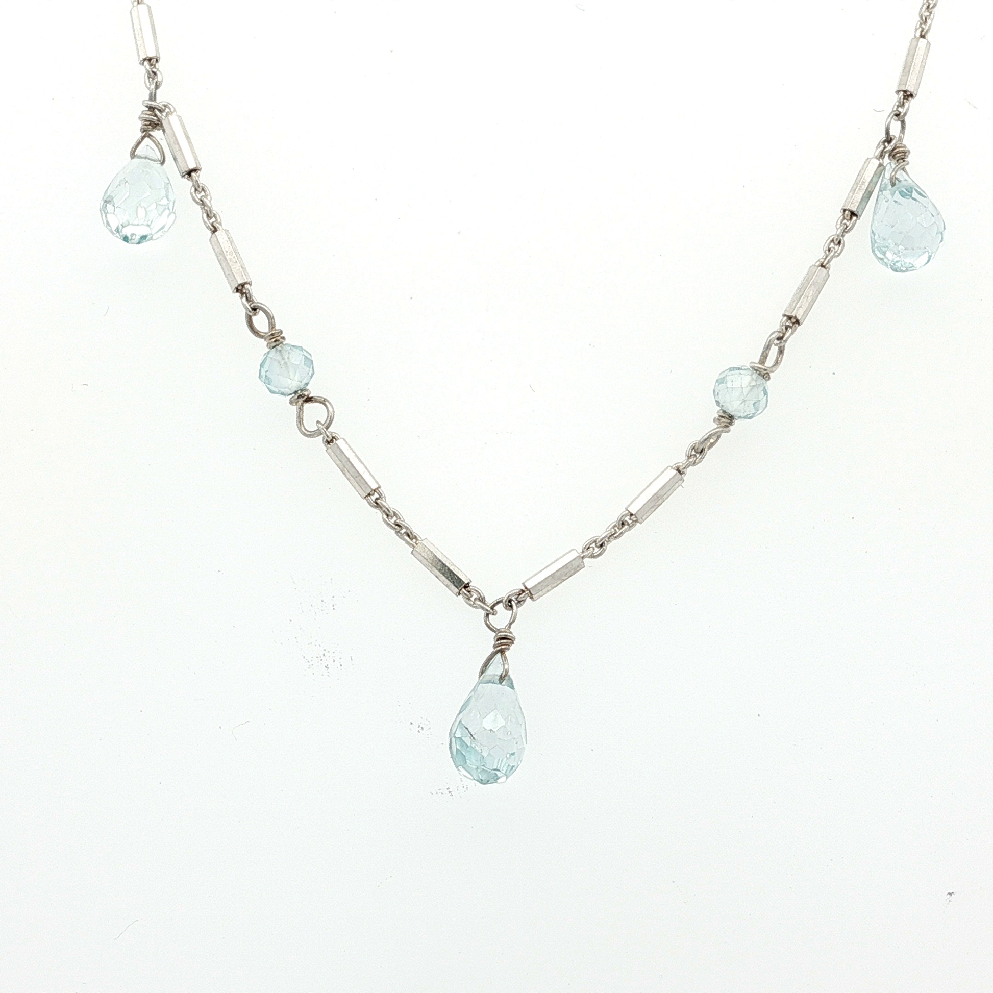 Elevate your style with this exquisite sterling silver chain necklace featuring delicately suspended, brilliant-cut pear-shaped blue topaz. These transparent, blueish green gemstones showcase exceptional clarity, polish, and symmetry. A timeless piece that exudes understated elegance.