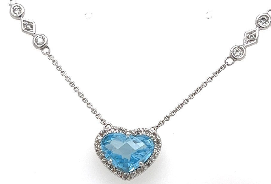 Blue Topaz Heart With Twenty One Diamond Halo And Diamonds On The Chain
