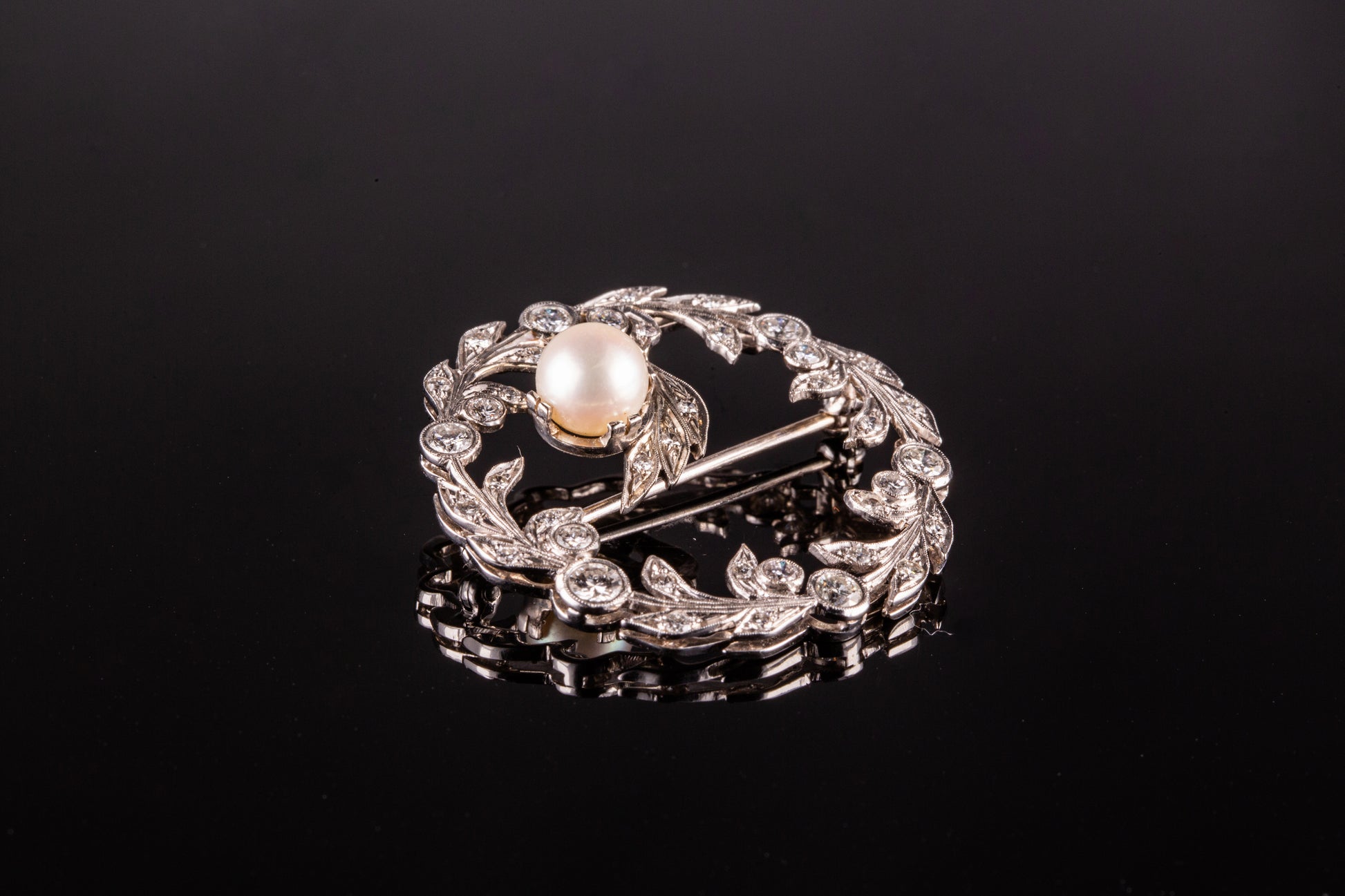 Vintage Cirlce Vine Brooch With Diamonds And A Pearl