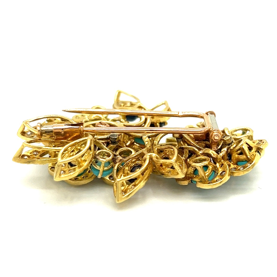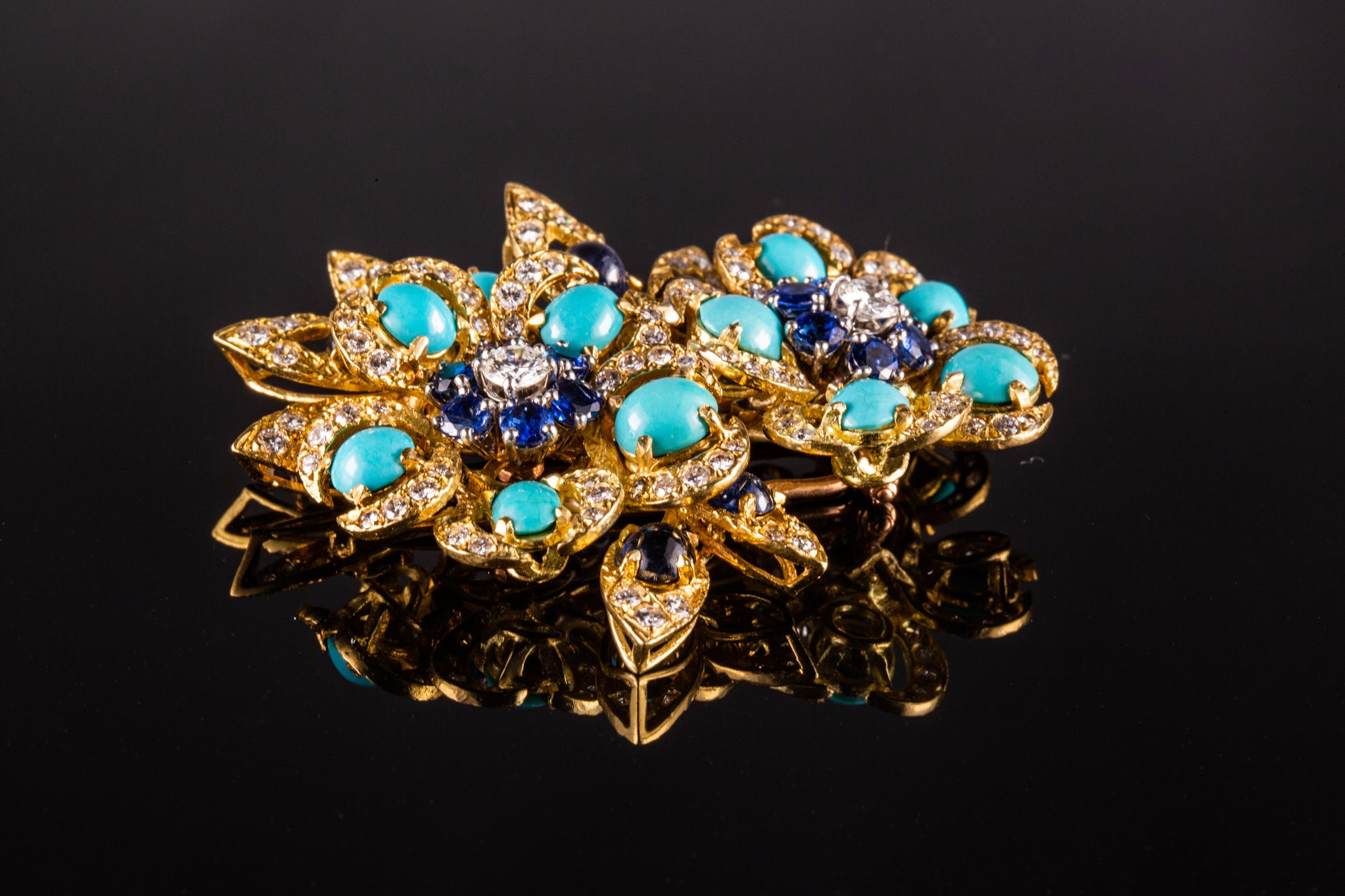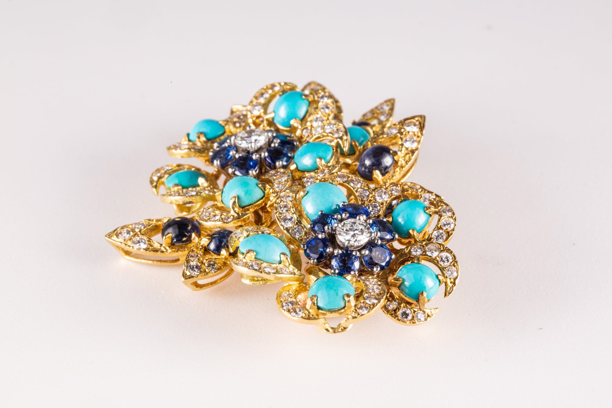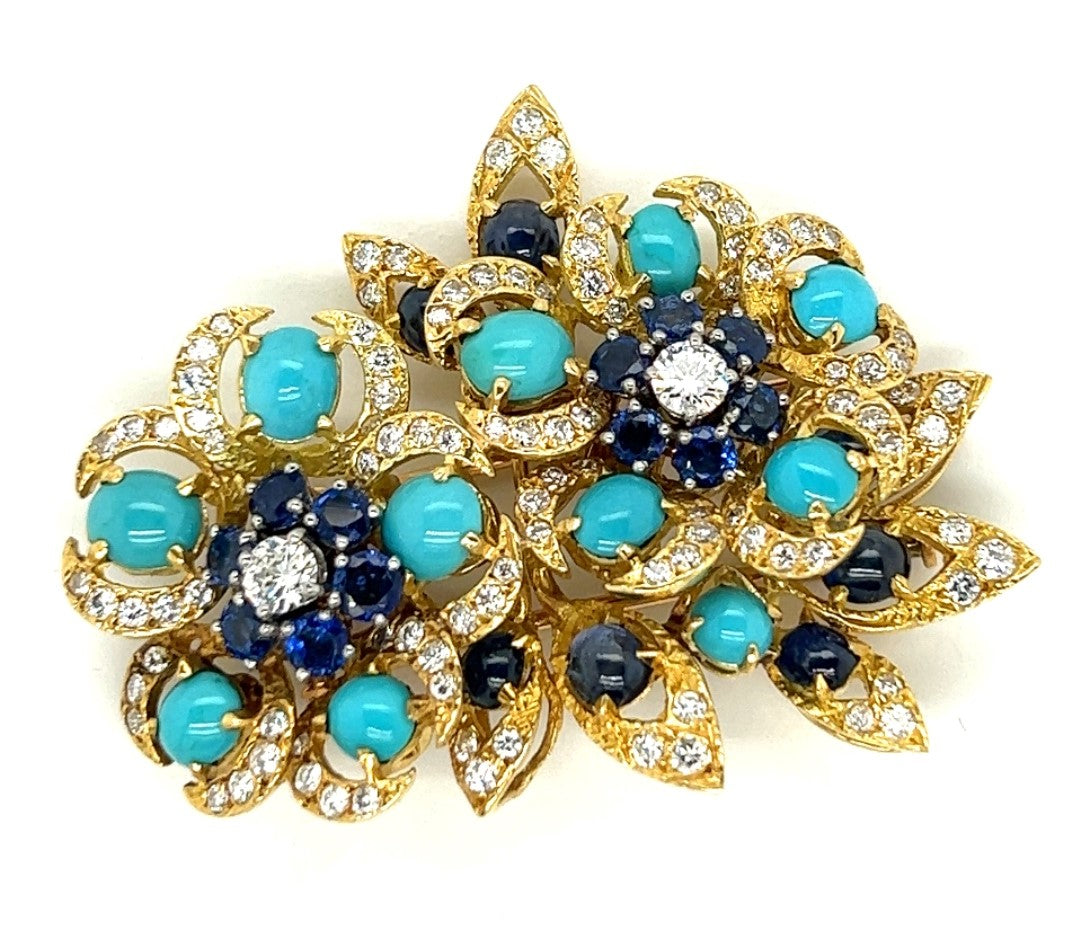 Vintage Double Floral Brooch with Blue Sapphire, Turqouise, Diamonds.