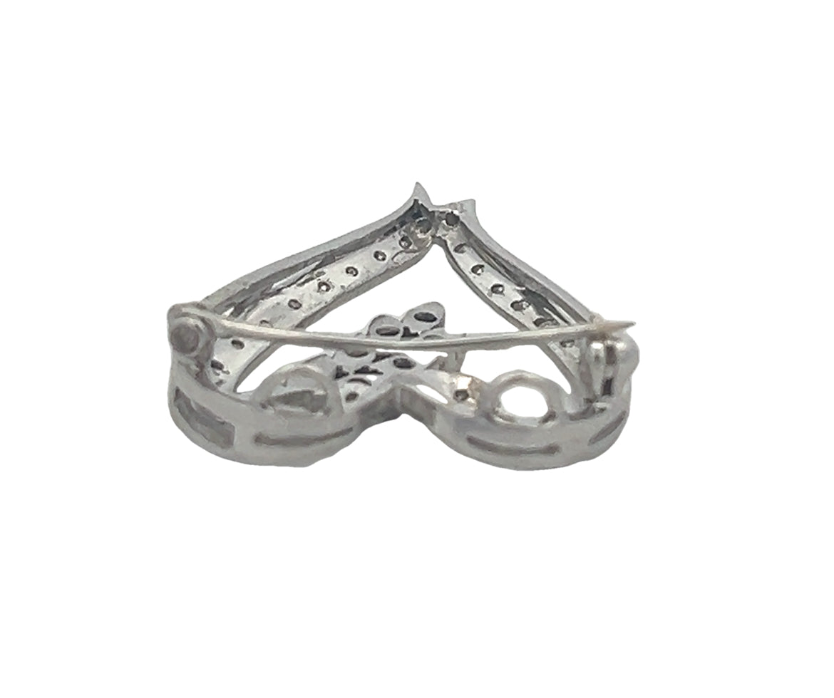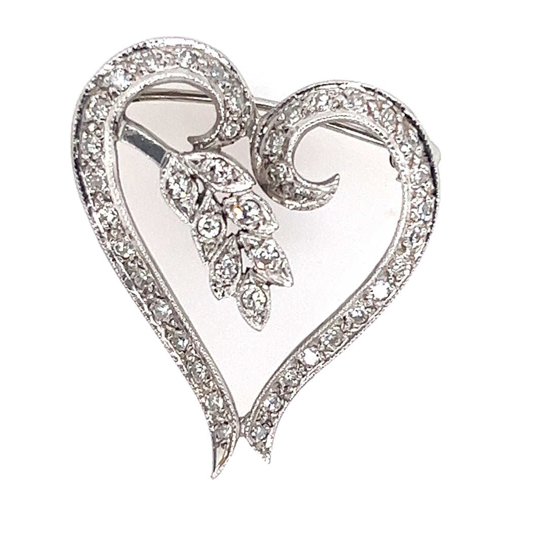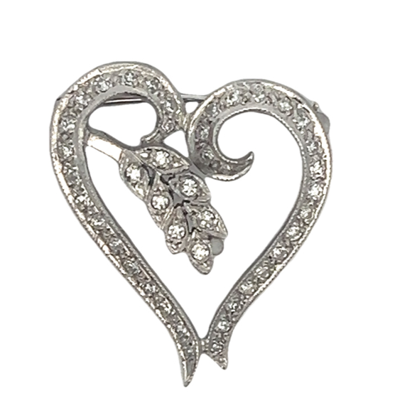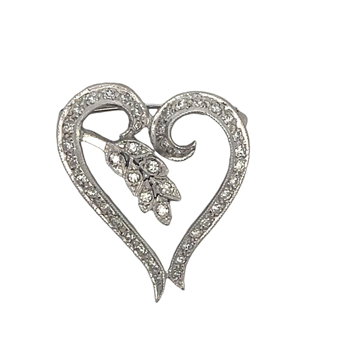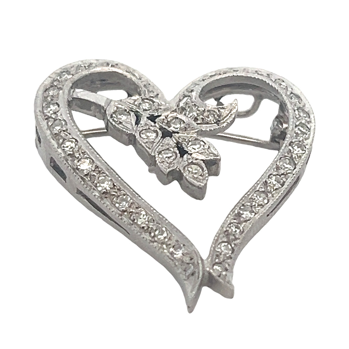 Vintage White 14 Karat Heart Pin 43=0.34Tw Round And Single Cut H/I Si1-Si-2 Diamonds