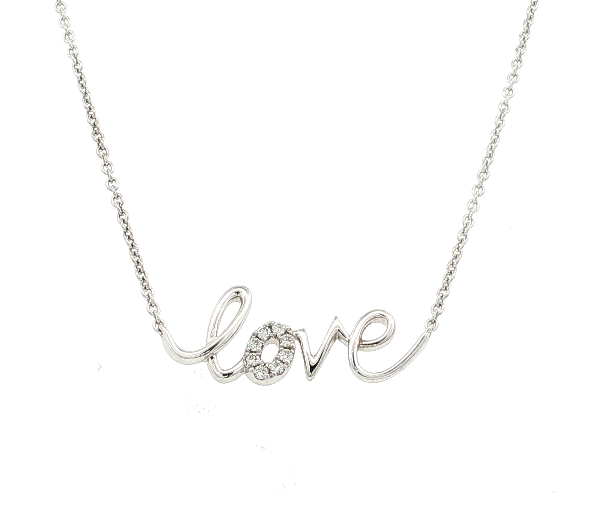 Express your affection with this delightful 'Love' Fancy link necklace. Crafted in white gold , this necklace showcases a delicate cursive 'Love' design adorned with a round brilliant cut diamonds on the O. A beautiful and meaningful piece, perfect for everyday wear or as a heartfelt gift.