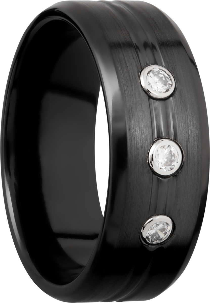 Zirconium 8mm beveled band with 3, .05ct bezel-set diamonds