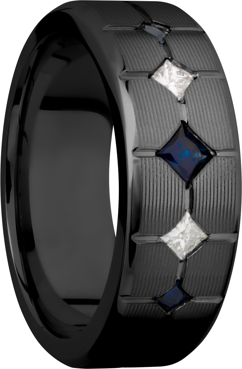 Zirconium 8mm beveled band with 3 sapphires and 2 diamonds