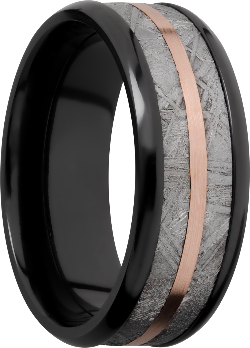 Zirconium 8mm beveled band with an inlay of authentic Gibeon Meteorite and a 14K rose gold inlay
