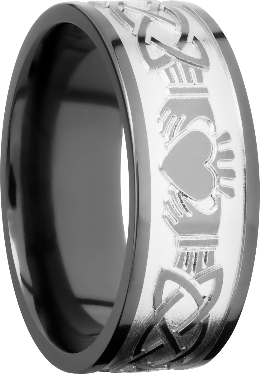 Zirconium 9mm flat band with a laser-carved claddagh celtic pattern