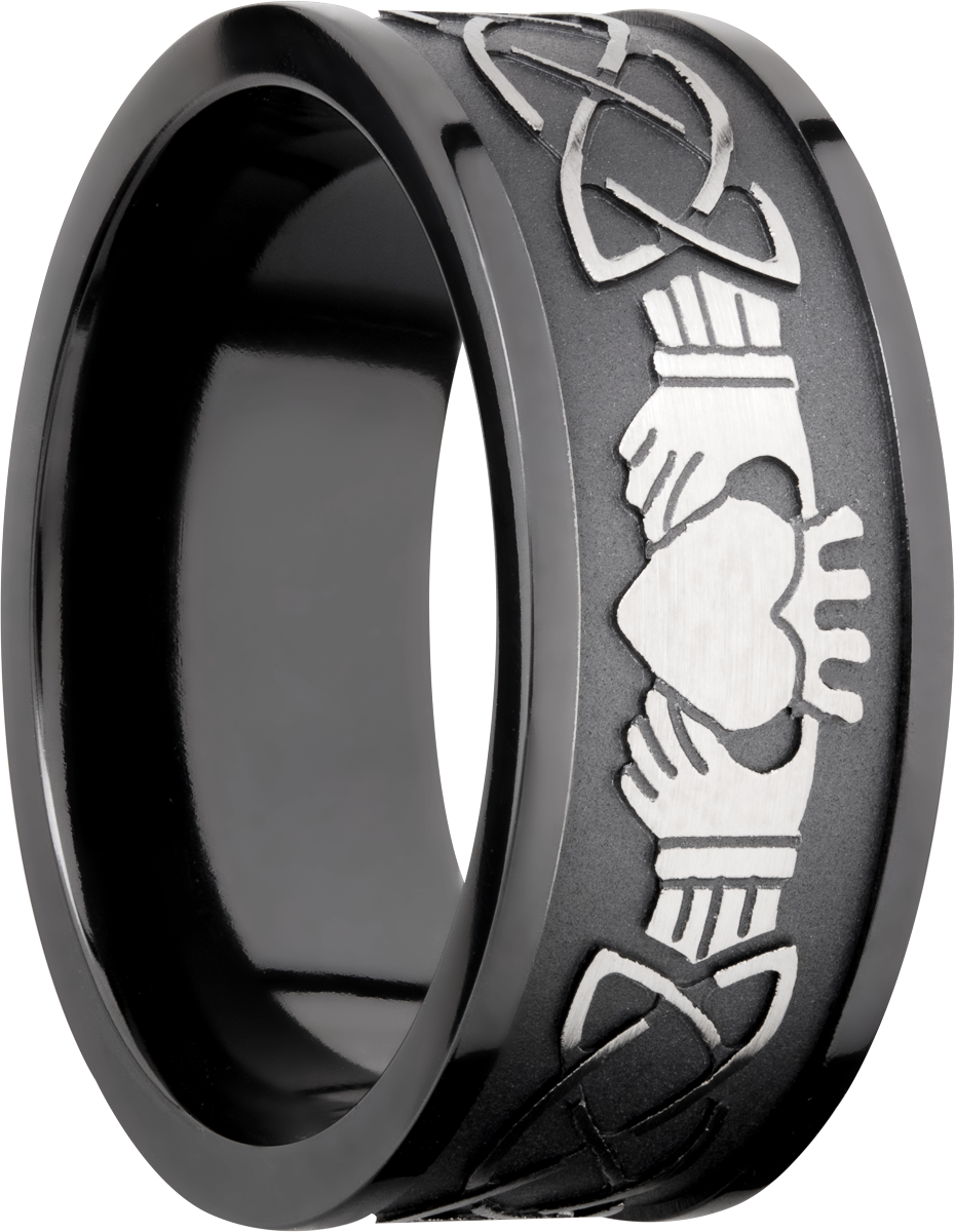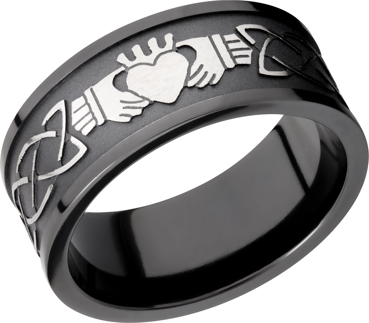 Zirconium 9mm flat band with a laser-carved claddagh celtic pattern