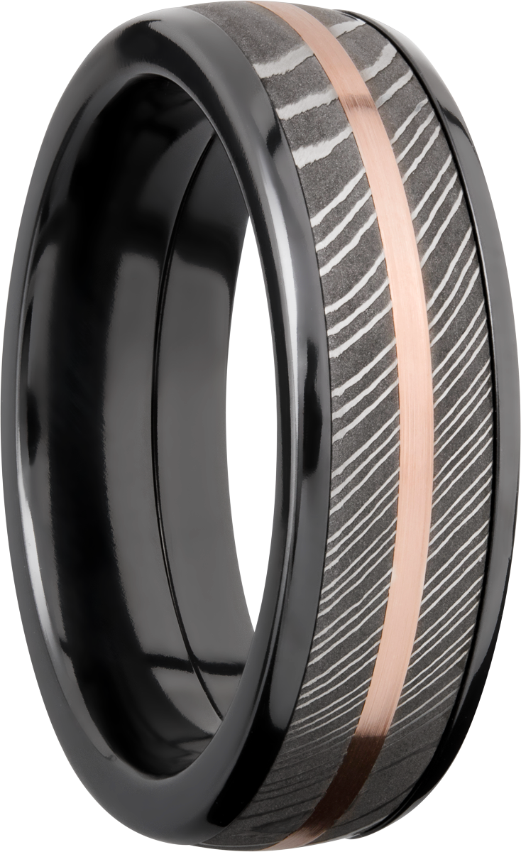 Zirconium domed 7mm band with a 5mm inlay of handmade Damascus steel and a 1mm inlay of 14K rose gold
